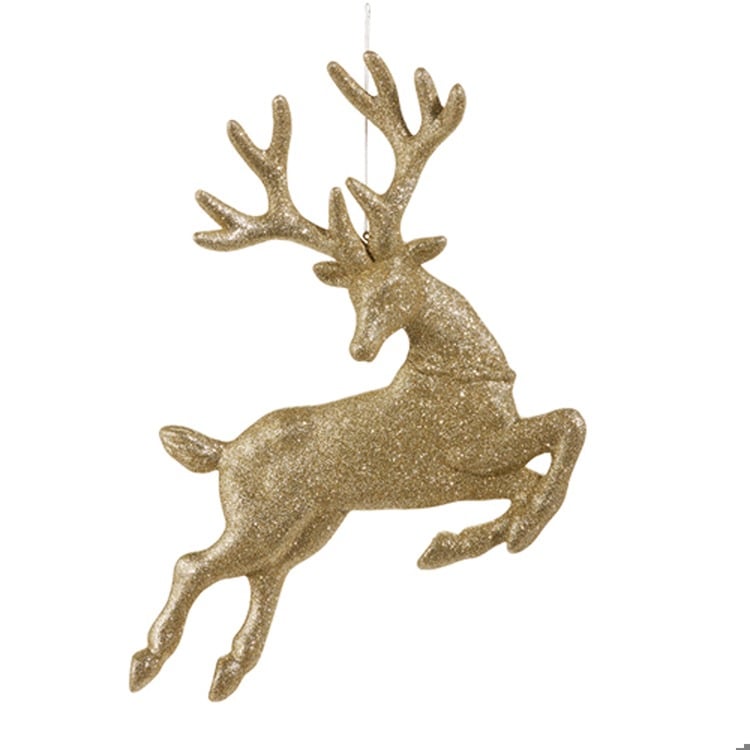 Add a touch of elegance to your holiday decor with this stunning 17.5" Champagne Glitter Leaping Deer Ornament. The ornament features a beautiful leaping deer design covered in sparkling champagne glitter, adding a touch of glamour to your Christmas tree or wreath. This ornament is sure to be a standout piece in your holiday decorations and will bring a festive and sophisticated look to your home. Make your holiday season merry and bright with this gorgeous ornament.