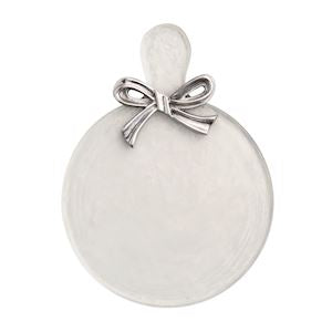 This sophisticated round glass paddle board features a layered cast aluminum bow, blending sleek design with sturdy craftsmanship. Ideal for serving and presentation, it adds a modern touch to your table setting while offering durability and style.