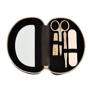 5-piece set. Foiled faux leather zipper pouch holds emery board, tweezers, scissors and nail clippers.