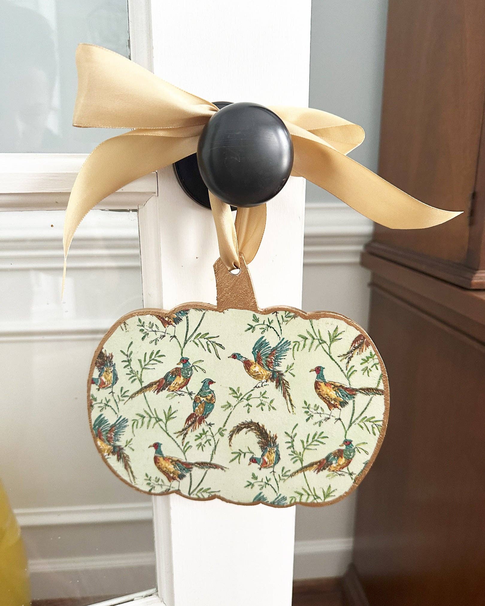 SoCharm Designs - Handmade Pumpkin Door Hanger - Flying Pheasants 8”